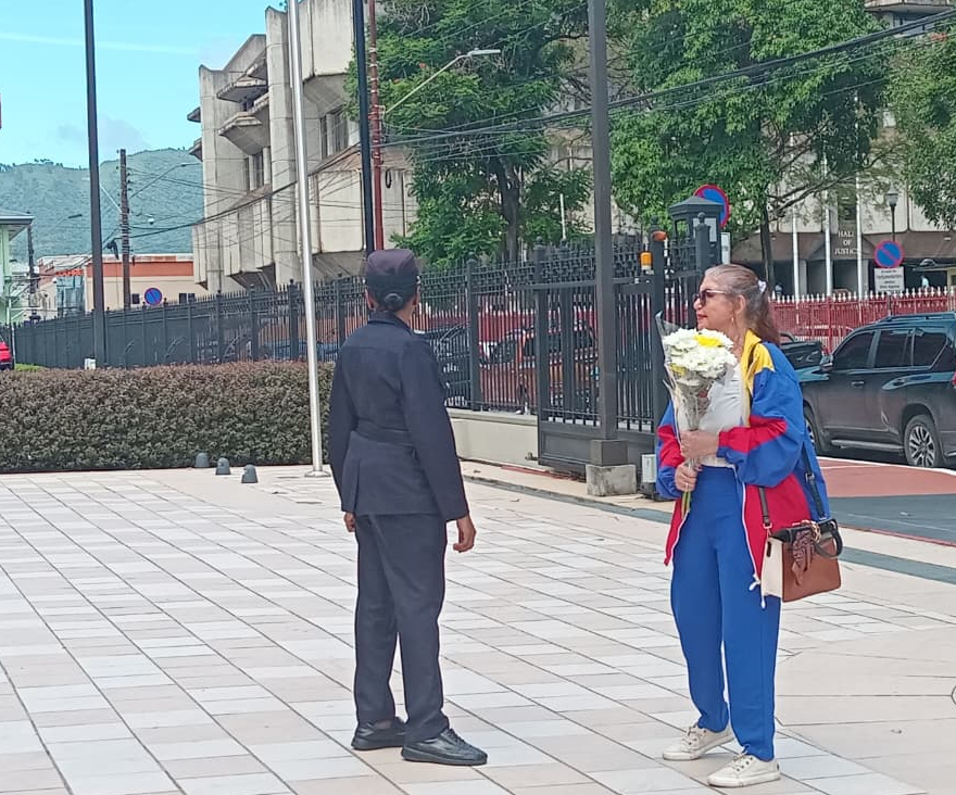 Persad-Bissessar was presented with a bouquet of flowers by Venezuelan activist Yesenia Gonazales who said that she was doing a good job in taking care of the Venezuelans in Trinidad.
