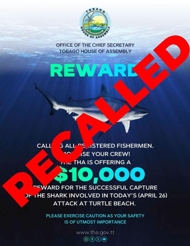 THE $10,000 bounty on the head of the bull shark that attacked a British tourist on Friday in Tobago has been retracted.
