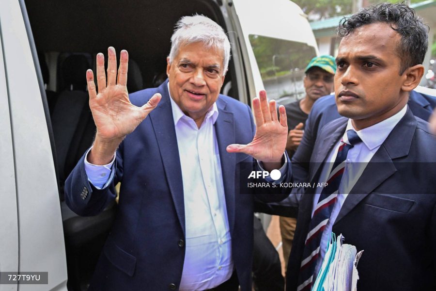 Caption: Sri Lanka’s former president Ranil Wickremesinghe, left, gestures as he arrives to appear before a court after his arrest in Colombo on August 22, 2025.
