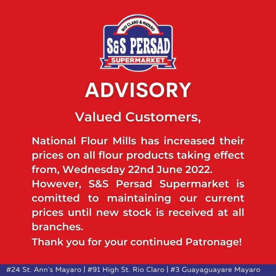 In an advisory, S&S Persad Supermarket with three locations in Mayaro and Rio Claro, stated: