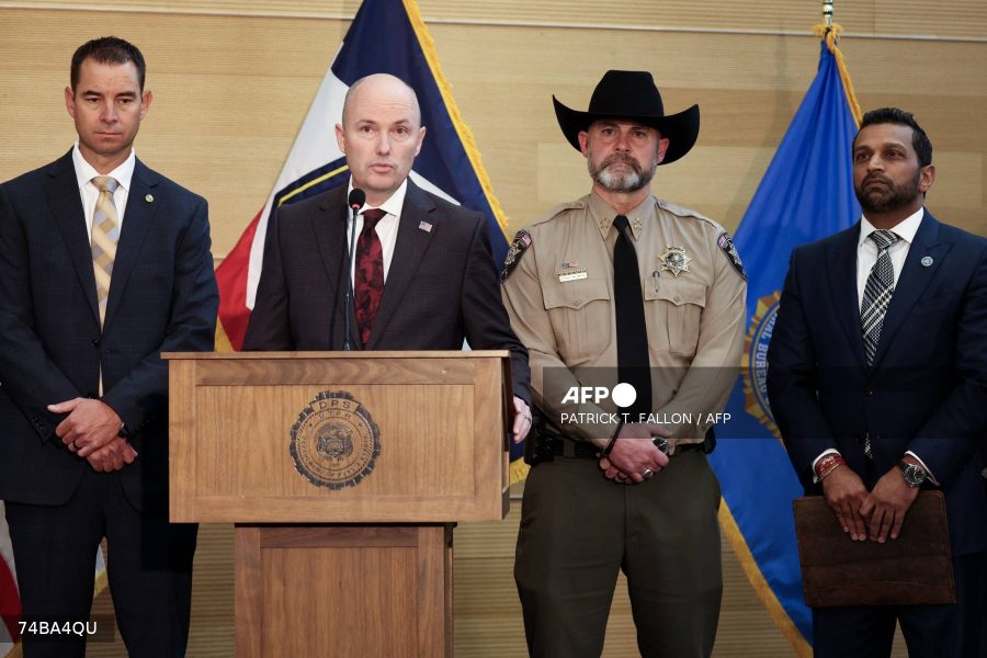 Caption: From left, Utah Department of Public Safety Beau Mason, FBI director Kash Patel, Utah Governor Spencer Cox and Sheriff Mike Smith attend a press conference outside the Doterra Auditorium at Utah Valley University after youth activist and influencer Charlie Kirk was shot during a public event in Orem, Utah, on September 12, 2025