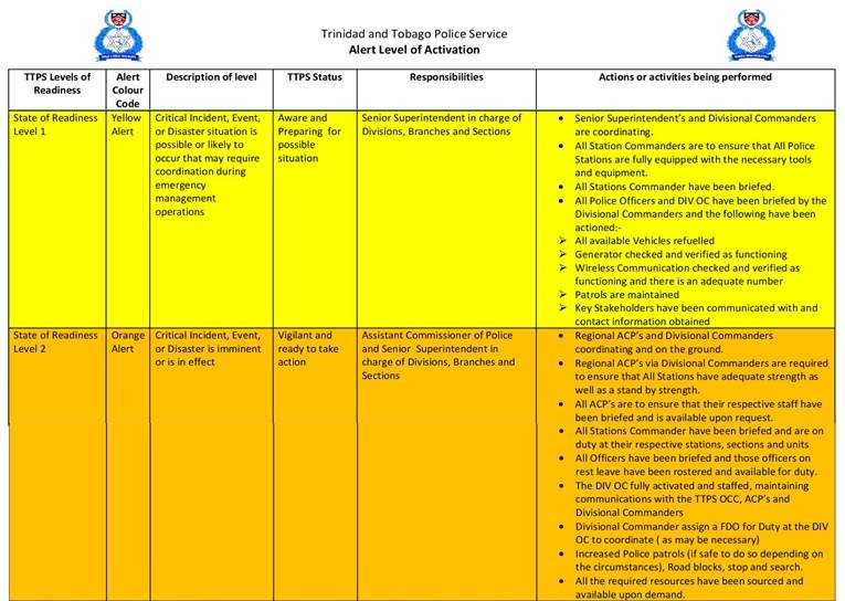 THE Trinidad and Tobago Police Service (TTPS) has moved it alert level up from yellow to orange. In …