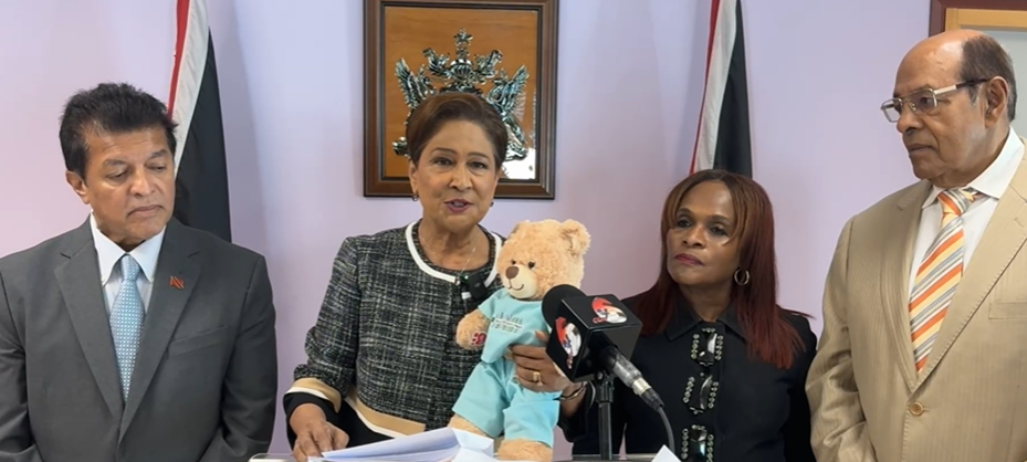 Caption: A screengrab of Opposition Leader Kamla Persad-Bissessar holding up a teddy bear dressed as a doctor which …