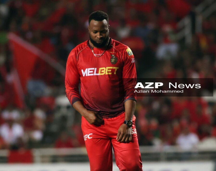 Caption: TKR skipper Kieron Pollard dances during a CPL match at the Brian Lara Cricket Academy during CPL …