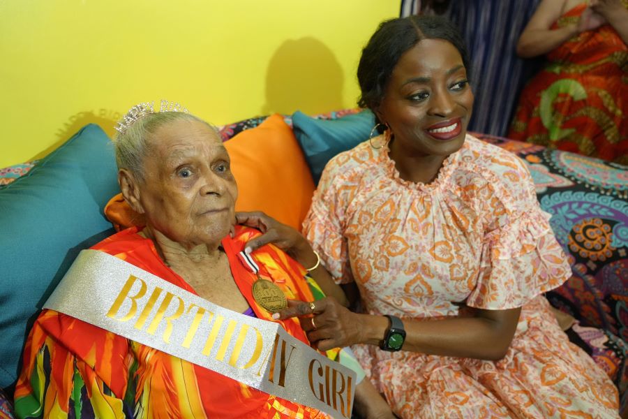 Caption: Centenarian Fanny Parris with Minister of Social Development and Family Services Donna Cox FANNY Parris, reached a …