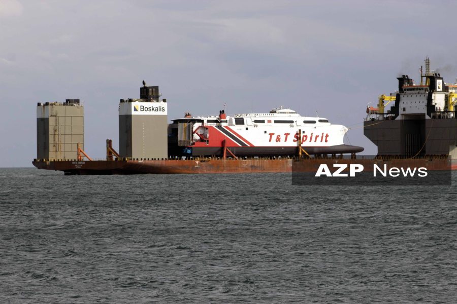 Caption: The T&T Spirt dry-docked on the HLV White Marlin on Monday off the coast of Chaguaramas near …