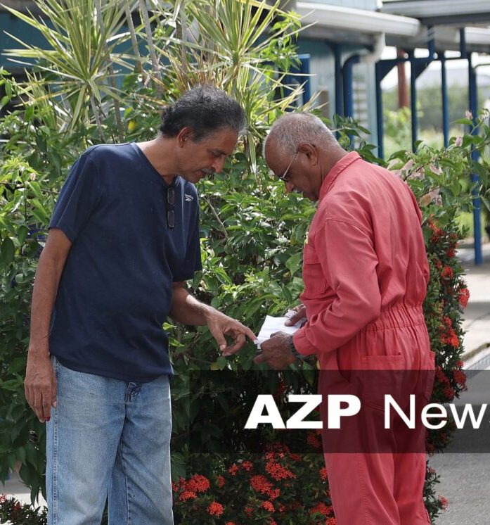 Caption: A voter at Charlieville Presbyterian School asks for help with his polling card during LGE 2023. AZP …