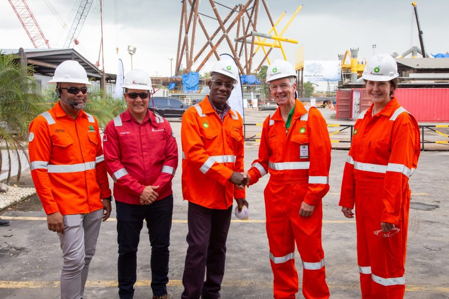 Caption: Prime Minister Dr Keith Rowley, centre, shakes hands with bpTT president David Campbell during a tour of …