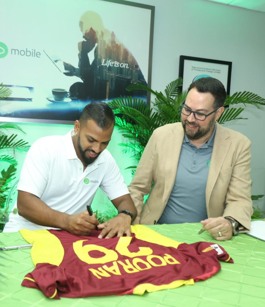 Caption: TSTT’s acting CEO Kent Western looks on as Nicholas Pooran, bmobile's newest brand ambassador, autographs a T-shirt …