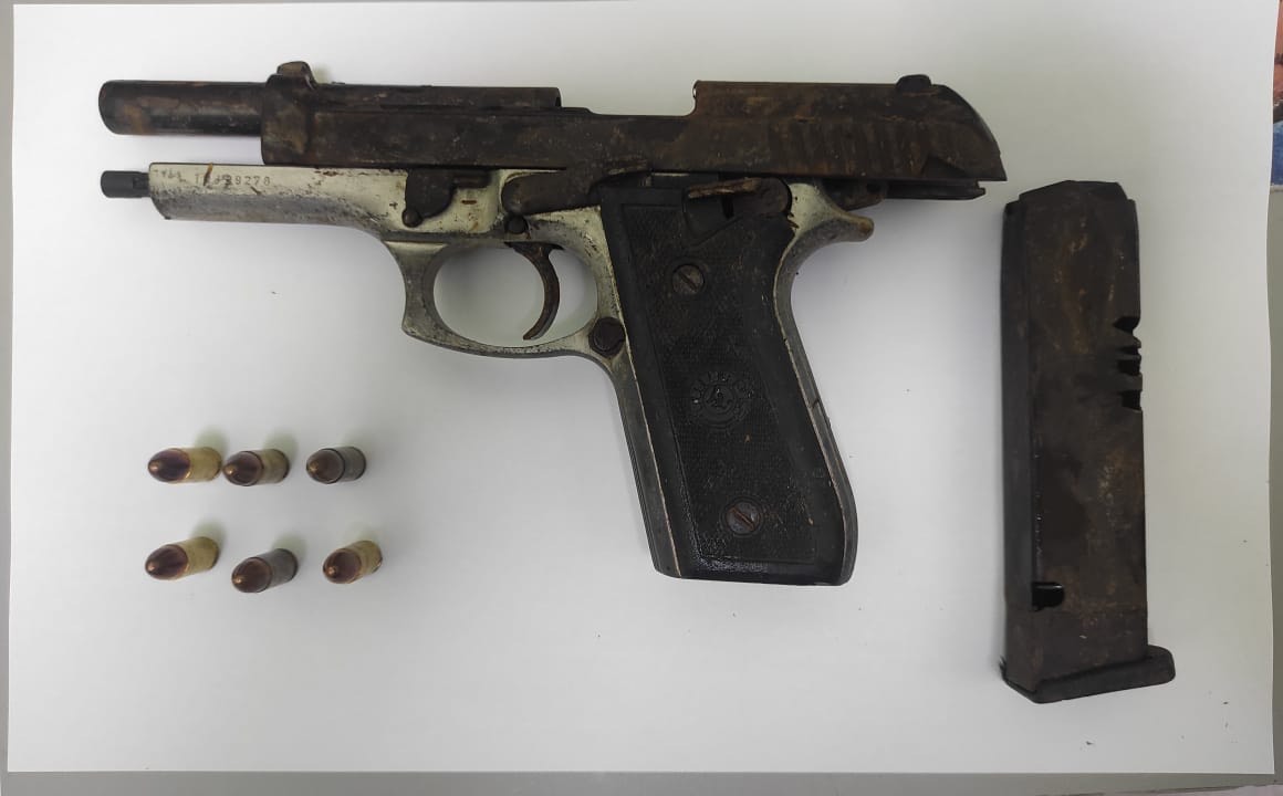 Caption: One Taurus pistol with magazine and six rounds of ammunition discovered at Manzanilla property. Photo: TTPS SEVEN …