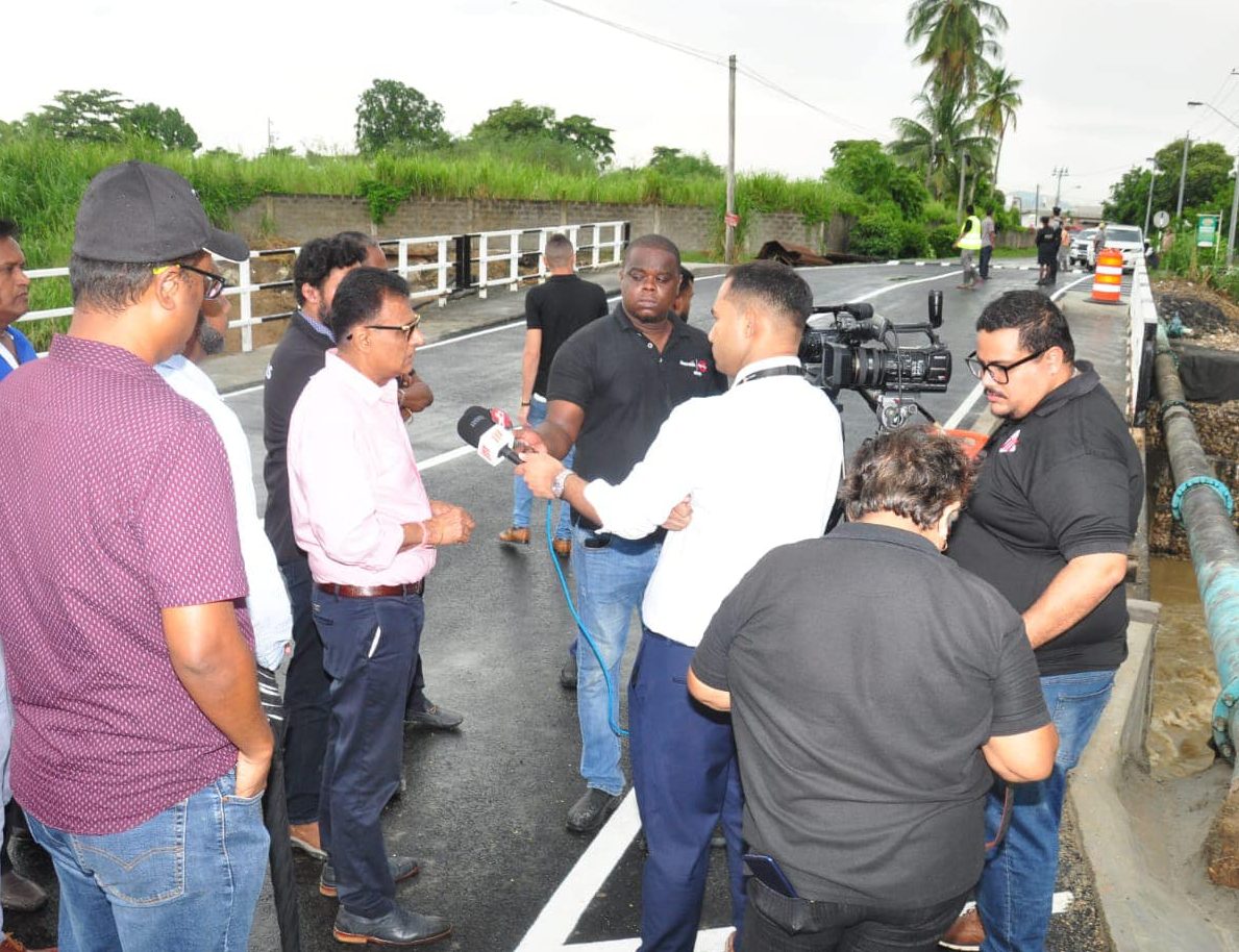 Caption: Minister of Works and Transport Rohan Sinanan on the Bridal Road Bridge speaking the media. Photo: MOWT …