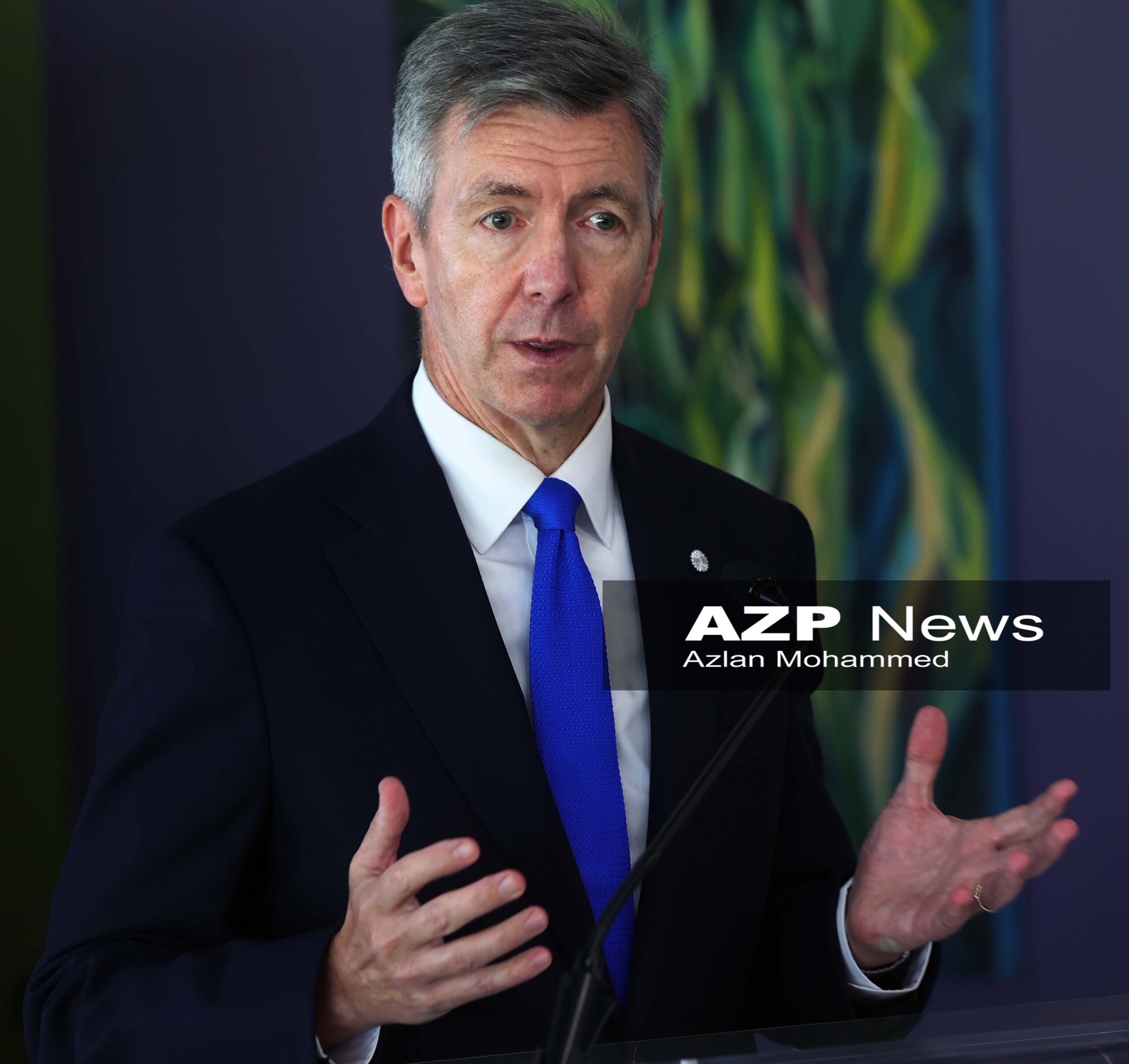 Caption: Prime Minister Dr Keith Rowley speaking at a press conference at the Diplomatic Centre in front of …