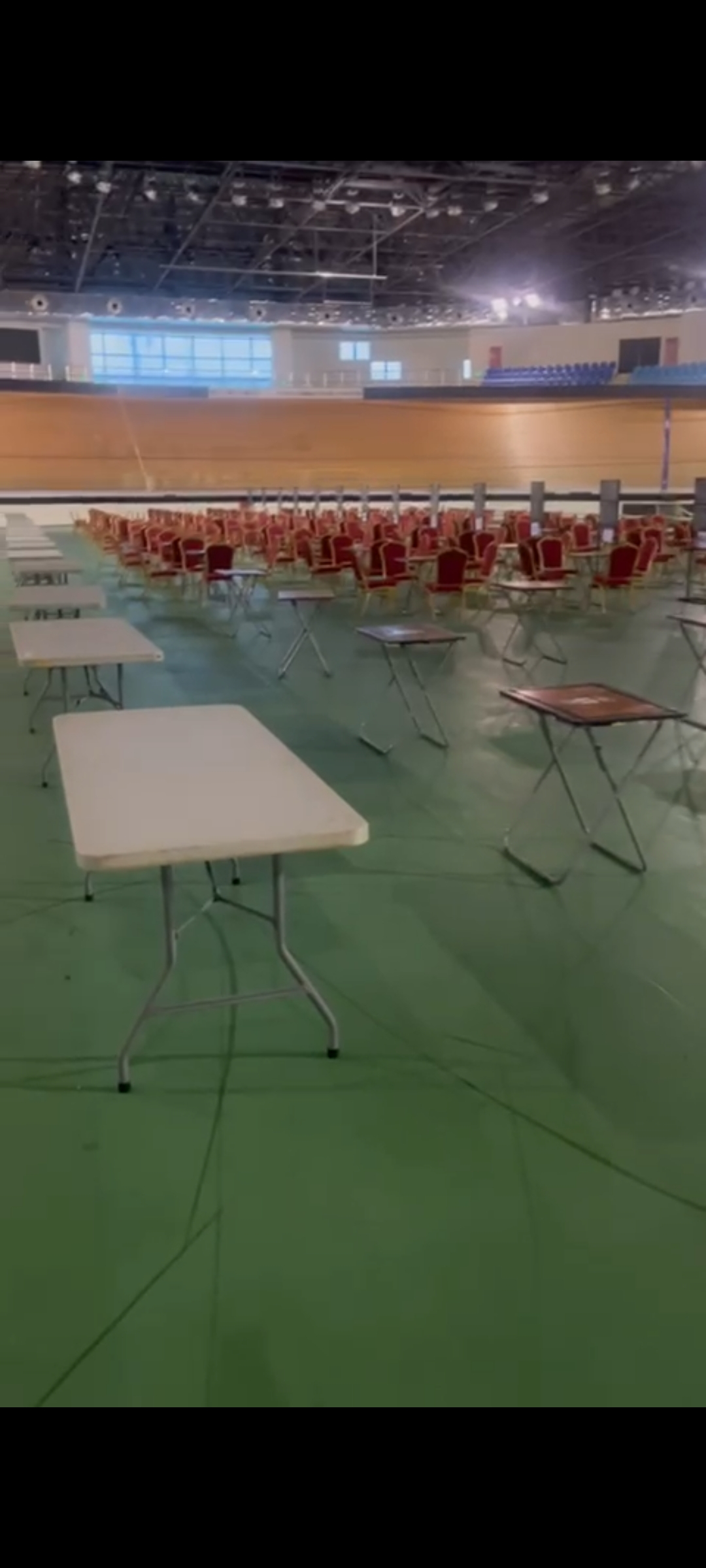 Caption: Screengrab from video showing tables set up at the National Cycling Velodrome for an all fours competition …