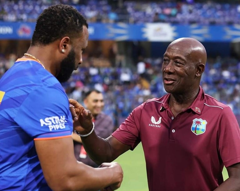 Prime Minister Dr Keith Rowley, right, with Kieron Pollard at the Wankhede Stadium on Friday. Photo: Facebook/Keith Rowley …