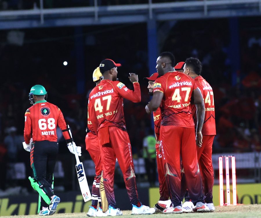 Caption: TKR players wearing number 47 on their t-shirts celebrate the wicket of Gudakesh Motie. Photo AZP News/Azlan Mohammed