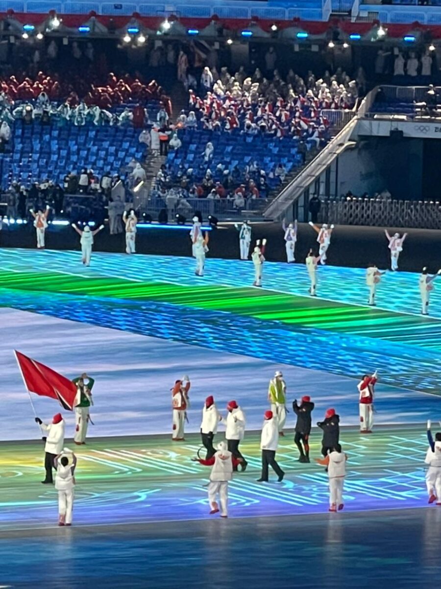 ANDRÉ MARCANO waves the national flag of Trinidad and Tobago at the opening ceremony of the 2022 Beijing Olympic Winter Games on Friday.