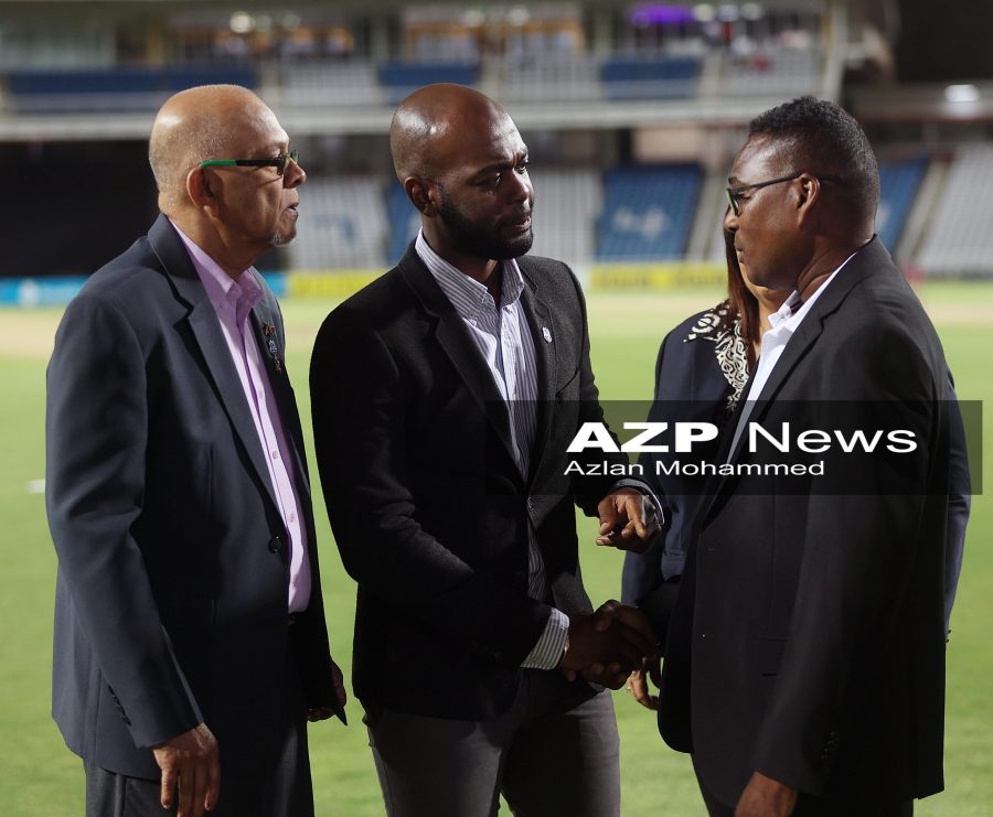 Caption: Minister of Sport Phillip Watts, right, chats with WICB President Dr Kishore Shallow and VP Azim Bassarath (file photo)