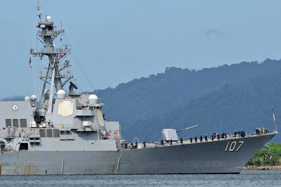 Caption: The USS Gravely warship enters the port of Port of Spain on October 26, 2025. Photo: AFP